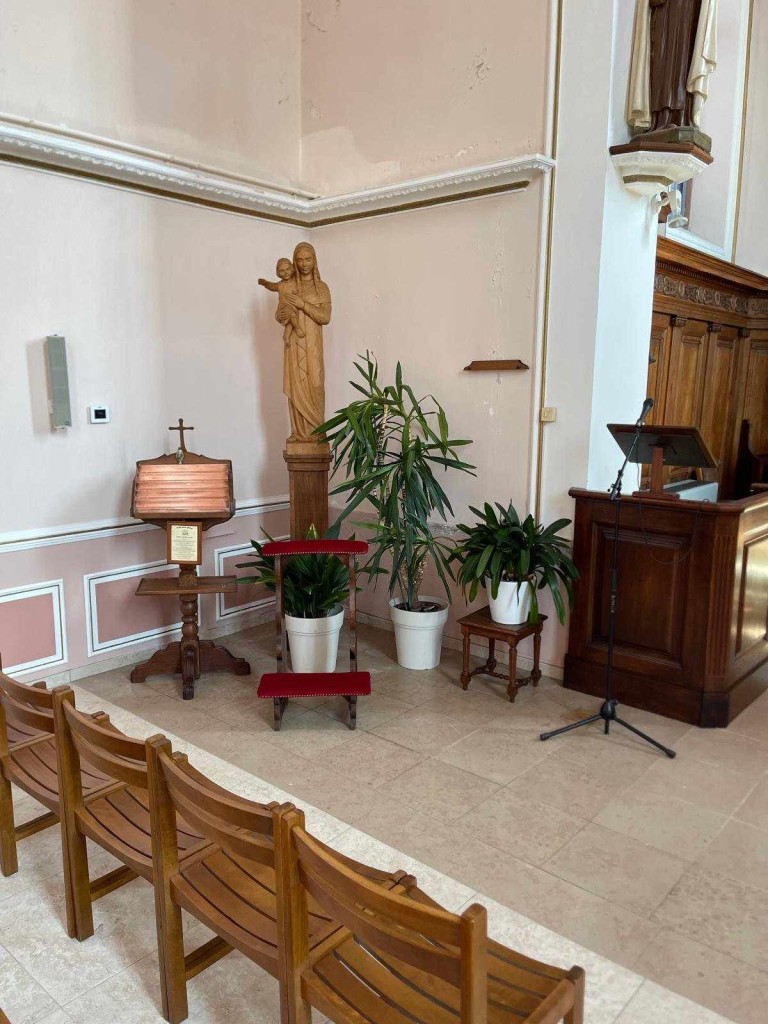 – le vieux plafond en panneaux de sapin, les ornements de l’église, les autels et confessionnaux seront transportés par les fidèles aux soins de M. le Maire dans un lieu de sûreté et à couvert pour être replacés après les travaux.